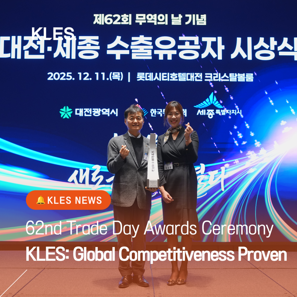 On Thursday, December 11th, KLES attended the '2025 Daejeon-Sejong Export Contributor Awards Ceremony' for the 62nd Trade Day, which was jointly hosted by the Korea International Trade Association (KITA) Daejeon/Sejong/Chungnam Regional Headquarters, Daejeon Metropolitan City, and Sejong Special Self-Governing City.