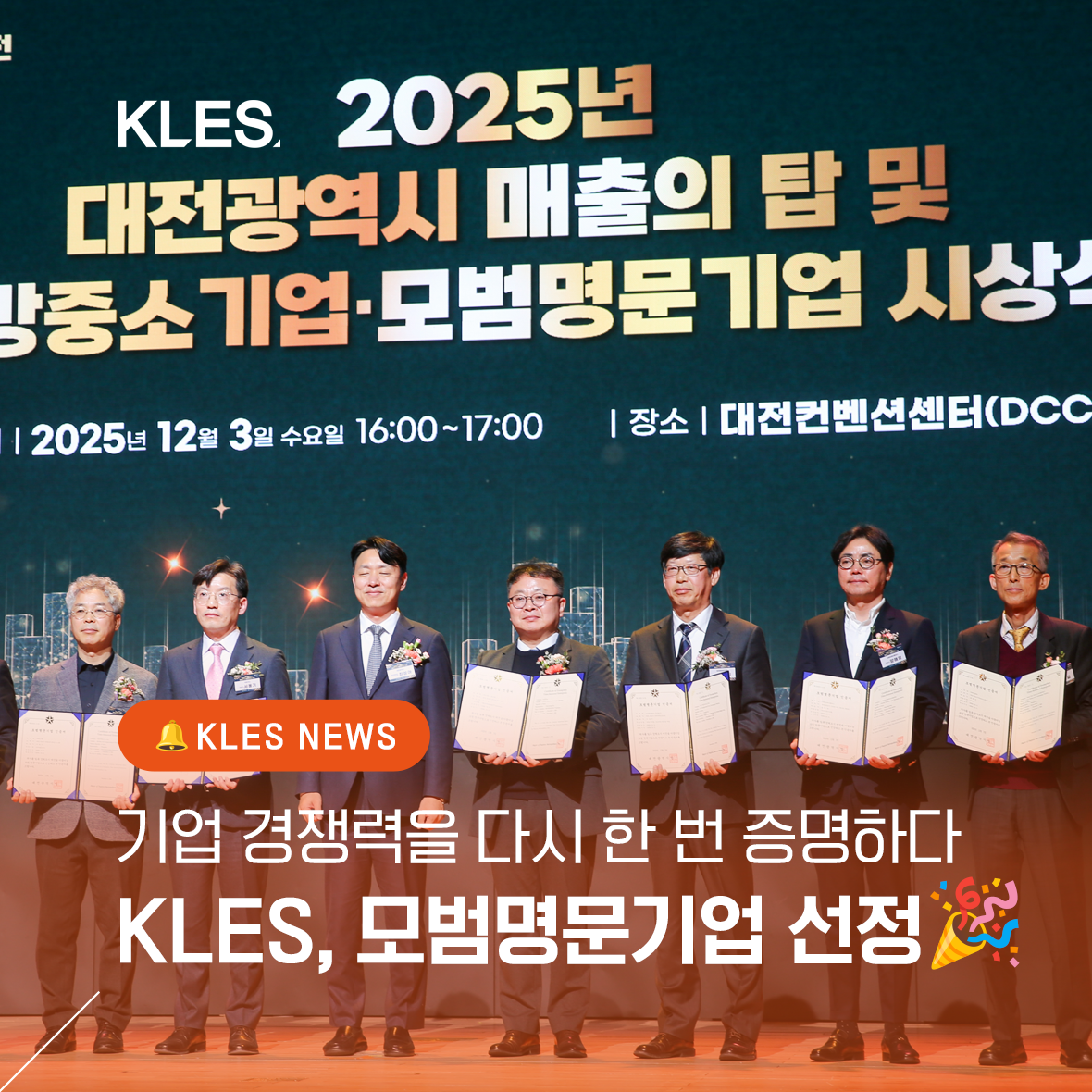 KLES, 2025 대전광역시 모범명문기업 선정 작성자 : KLES 작성일 : 2026.01.12 조회수 : 85 KLES, 2025 대전광역시 모범명문기업 선정 더욱 자세한 내용은 아래 링크를 통해 확인하세요! https://blog.naver.com/klesblog/224098949732 KLES,_모범명문기업_선정.png (1.9MB) 이전글 KLES, 한국중부발전 동반성장 포럼 참여… 새 운영진과 함께 도약 다음글 KLES, 2백만불 수출의 탑·산업통상자원부장관 표창 수상 목록으로