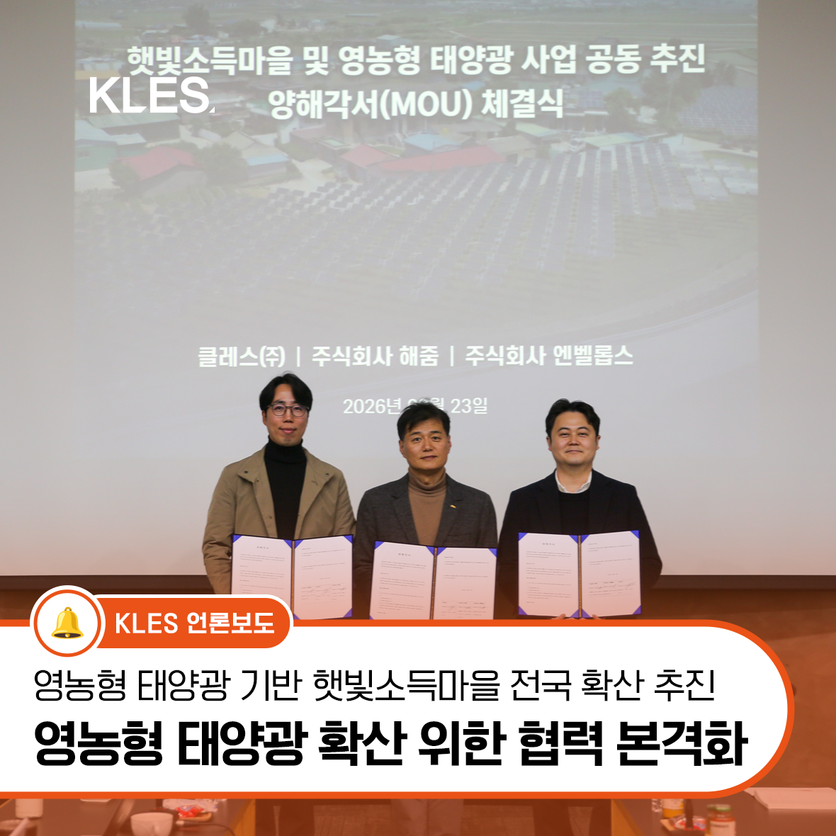 KLES, 영농형 태양광 확산 위한 협력 본격화 작성자 : KLES 작성일 : 2026.03.27 조회수 : 1 KLES, 영농형 태양광 확산 위한 협력 본격화 더욱 자세한 내용은 아래 링크를 통해 확인하세요! https://blog.naver.com/klesblog/224193790319 영농형_태양광_확산_위한_협력_본격화.png (1.4MB) 이전글 함께 나누는 설의 기쁨, KLES 설날 행사 다음글 KLES 사내강연, 나를 이해하는 시작 목록으로